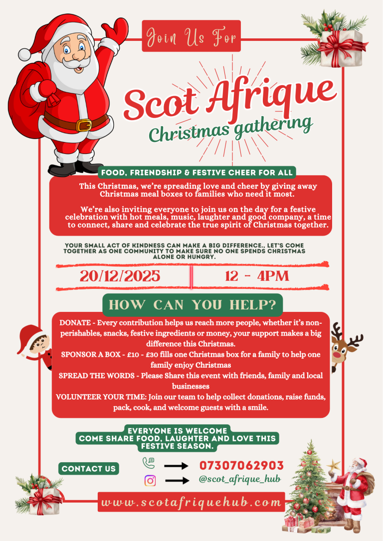 Join Scot Afrique Hub as a volunteer and help bring people together through meals, activities and support programs. A few hours of your time can create smiles, friendships and lasting connections. Be part of something meaningful.